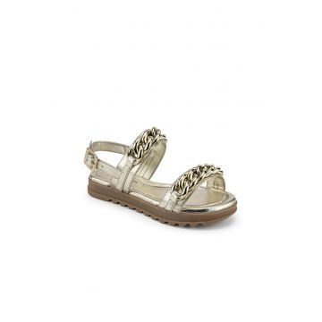 55% 396 LEICaracteristici Culoare: alb - auriu Imprimeu: uni Material: poliuretan Sistem inchidere: catarama Tip talpa: plata Compozitie Partea superioara: alte materiale Material interior: alte materiale Material