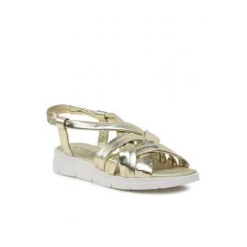 Caracteristici Tip: cu platforma Culoare: auriu Material: piele naturala Imprimeu: uni Stil: casual Varf: rotund Tip talpa: wedge Culoare elemente metalice: auriu Sistem inchidere: catarama